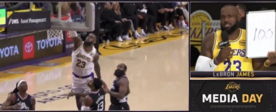 詹姆斯虽然从未参加扣篮大赛,但他无疑也是NBA顶级扣将,生涯有太多精彩隔扣。如今詹姆斯在新赛季媒体日接受Spectrum SportsNet采访,他给自己2019-20赛季隔扣别利察打10分,2021-22赛季隔扣好友乐福打9分,而2023-24赛季隔扣乔治打100分。