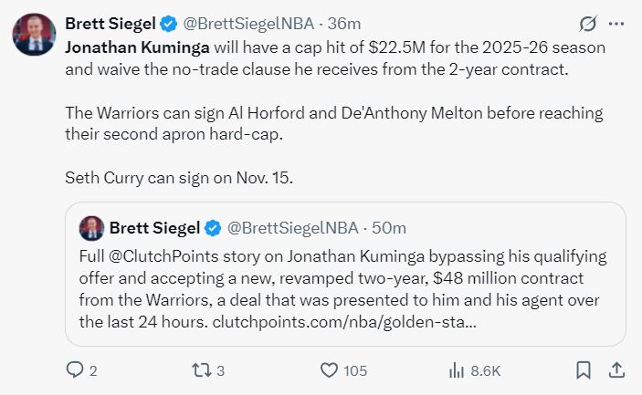 根据NBA记者Brett Siegel的解析:库明加25-26赛季的薪资为2250万,并且他将放弃这份为期两年合同中的交易否决权,勇士队可以在达到第二薪资上限之前签下霍福德与梅尔顿,赛斯-库里可以在11月15日后签约。