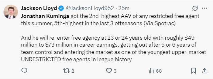 他将在23岁或24岁重新进入自由市场,届时他的职业生涯收入约为4900万-7300万,在球队拥有他的掌控权5-6年后,他将成为联盟历史上最年轻+不受限制的顶级自由球员之一。