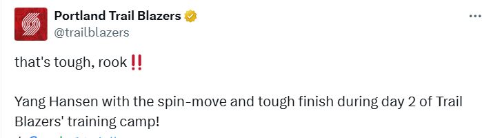 北京时间10月2日,开拓者训练营第二日,官方社媒晒出了杨瀚森的一记进球。只见,他背身单打,突然转身到篮下,打成一记漂亮的2+1,开拓者队友为他欢呼。官方社媒配文是:“太强硬了,新秀!杨瀚森在训练营第二日用一记转身动作和强硬终结完成得分!”