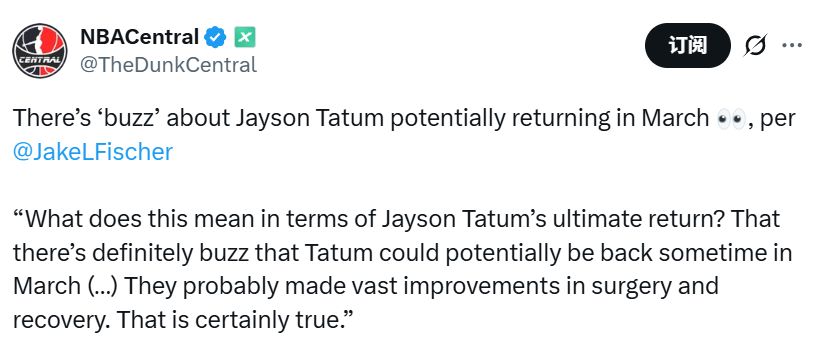 Fischer指出,凯尔特人本赛季的战绩走向,将对塔图姆的复出时间起到决定性作用。联盟内部人士透露,凯尔特人对自身在东部的竞争力仍抱有更高期待。