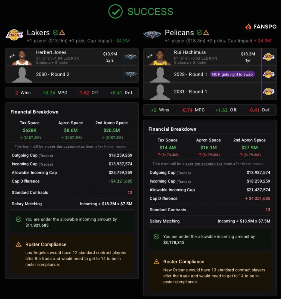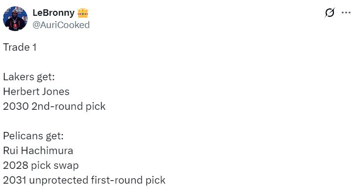 他的方案是湖人送出八村垒+2028年首轮互换权+2031年不保护首轮签,得到琼斯+2030年次轮签,这笔交易鹈鹕等于得到两个首轮签,湖人拿出了最大的诚意。这样琼斯就可以打先发三号位,防守最好的先发斯玛特、东契奇、琼斯、詹姆斯、艾顿。