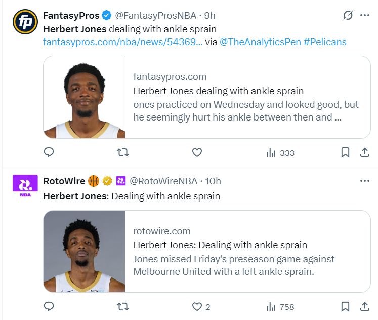 北京时间10月4日,NBA记者埃文-斯迪瑞报道,多支竞争对手密切关注鹈鹕,特别是赫伯特-琼斯与特雷-墨菲这两位侧翼球员。目前鹈鹕还不愿意交易他们,但如果新赛季开局不利并接到大量咨询电话,这两人任何一人进入交易市场,鹈鹕都可以得到丰厚回报。