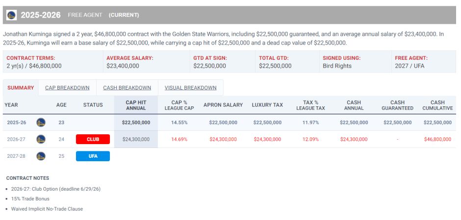 根据薪资网站的报道也的确是这样,库明加25-26赛季2250万,26-27赛季2430万,合同包含15%的交易保证金,放弃交易否决权。