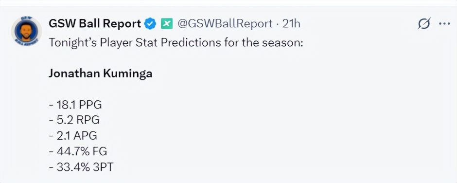 勇士媒体预测新赛季库明加场均能拿到18.1分5.2篮板2.1助攻,命中率44.7%,三分命中率33.4%。上赛季库明加场均15.3分4.6篮板2.2助攻,命中率45%,三分命中率31%。