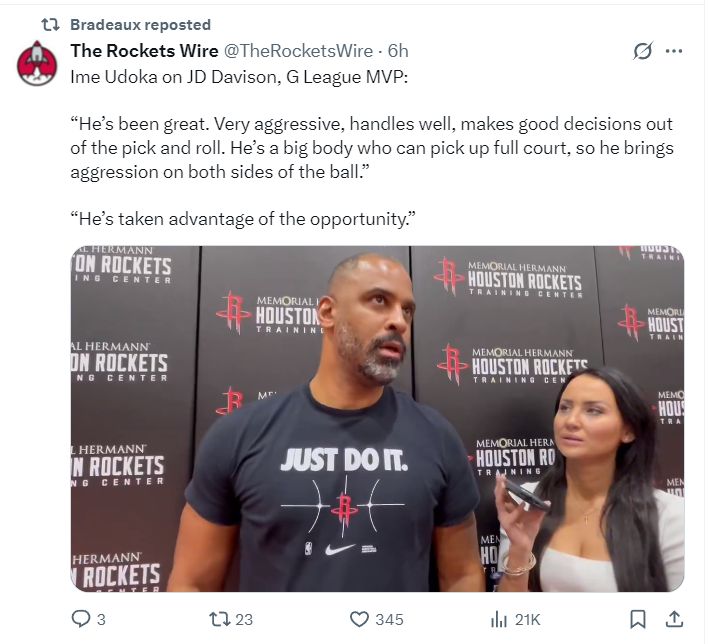 乌度卡除了重申只确定四个先发以外,他还盛赞了双向合同球员戴维森,他说道:JD是G联赛的最有价值球员,他在训练营表现很出色,进攻积极性很高,控球能力也不错 ,挡拆配合中可以做出明智的选择。身材高大、能掌控节奏,攻防两端极具侵略性,他抓住了这个机会。