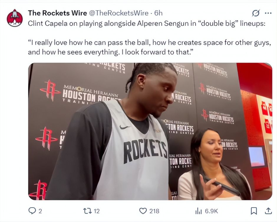 卡佩拉在采访中谈到双塔战术的情况:申京太出色了,我非常欣赏他的传球能力,他可以为队友创造空间,他对比赛的全局洞察力很惊人。