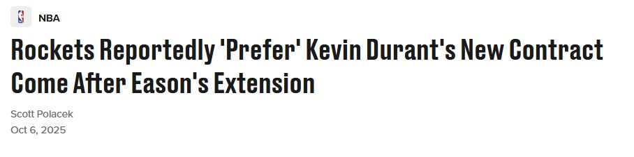 火箭记者:火箭总经理在球队媒体日拒绝透露杜兰特的提前续约谈判的进展