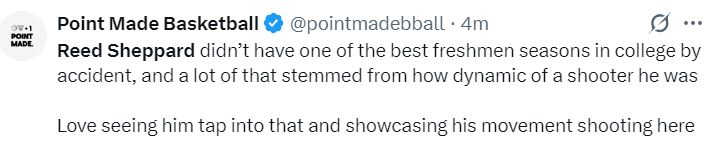美媒:谢泼德在NCCA时期打出了高光表现绝非偶然,他是一位极具进攻性的投手,真期待看到他能延续这种表现,继续展示他的漂移三分。