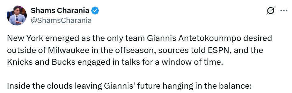 北京时间10月7日,名记Shams长文报道了字母哥,透露这位希腊巨星除了雄鹿,只愿意效力纽约尼克斯。尼克斯和雄鹿也曾在8月份进行过关于字母哥的交易谈判,只是最终未能取得进展。