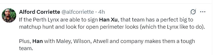 澳洲记者怀尔德写道:这对山猫队的球迷来说是一个巨大的利好,韩旭的能力是全世界最顶级的,她在亚洲区更是第一档球星的存在,山猫队第一场比赛是10月19日对阵阿德莱德。
