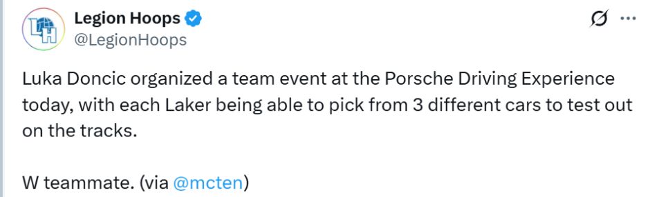 据ESPN记者麦克梅纳明报道,在湖人队的训练结束后,东契奇决定组织一场球队团建活动。湖人队在今年夏天进行了部分阵容调整,目前仍处于团队默契培养阶段。为推进这一进程,东契奇策划了此次保时捷驾驶体验活动。麦克梅纳明表示,队员们将有机会驾驶该品牌的多款高端车型。每位湖人球员都可以从3辆不同的汽车中挑选一辆在赛道上进行测试。