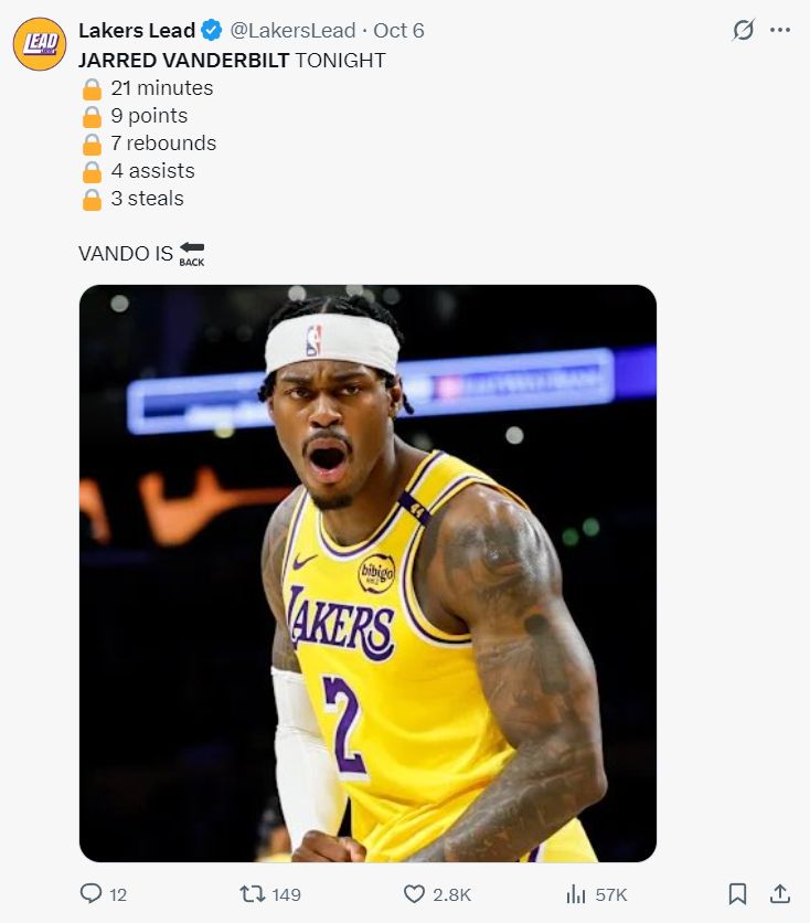 其实在八小时之前湖人媒体Lakers Visuals就力挺范德彪:本赛季我期待范德比尔特能再次成为联盟中最顶级的防守者之一,并且他会向外界展示他在三分投射上的努力。别忘了一点,他会在自己的保险库里添加更多需要锁定的名字。