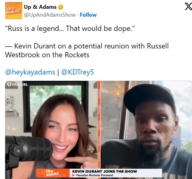 在凯-亚当斯的播客节目中,杜兰特称威斯布鲁克能否加盟火箭与自己“无关”。“我完全不清楚,也没向任何人打听过。这件事根本没被提上议程,而且通常这类事要是有眉目,动静都会很大,”杜兰特说,“但除了网上球迷的讨论,我没听到任何相关消息。”