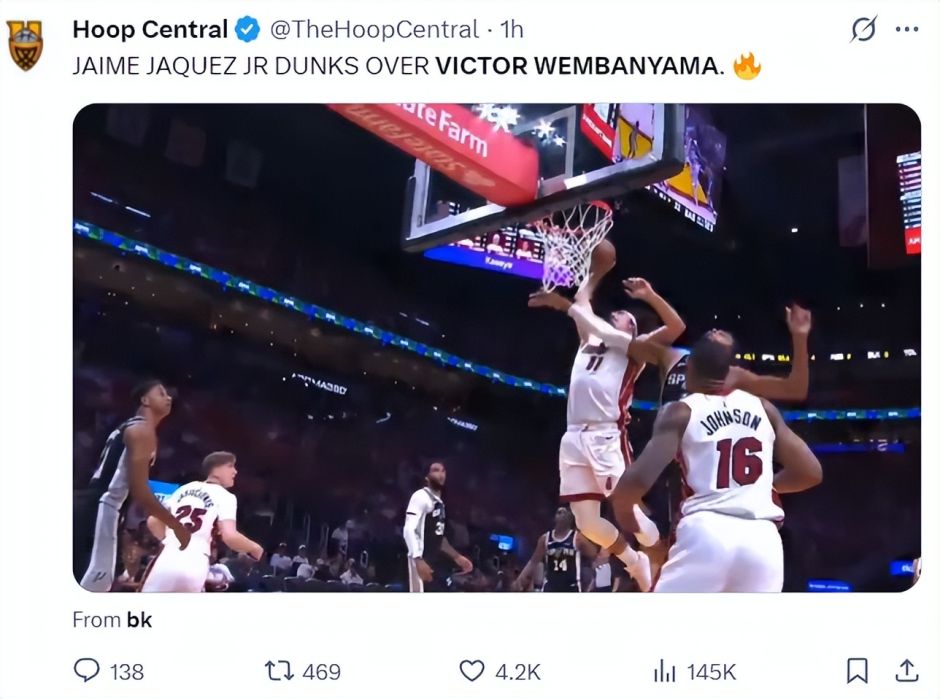 不过这场比赛文班亚马也有一个尴尬时刻,那就是他被小海梅-哈克斯给隔扣了,而且这个隔扣文班亚马明显有犯规,他的手掌结结实实的打在哈克斯的胸口,文班亚马很少被别人这样隔扣。