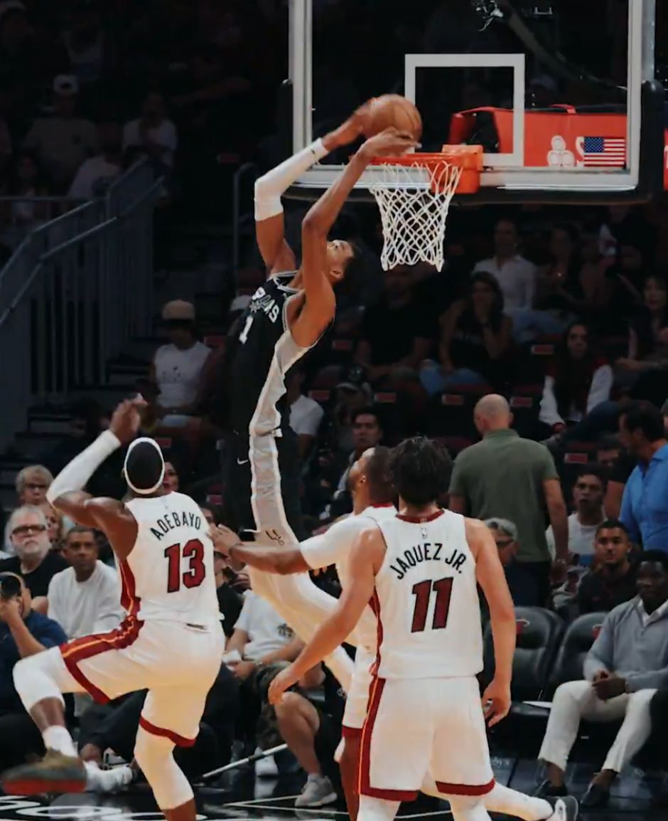 第三节文班亚马又一次展现了他顶级天赋,直接在热火三人合围的情况下完成空接背扣,这一球让热火主场的球迷们都惊呼连连,单节文班亚马4中2拿到4分2篮板1助攻,三节打完21分钟,9中4,拿到10分4篮板5助攻1抢断2盖帽5失误。