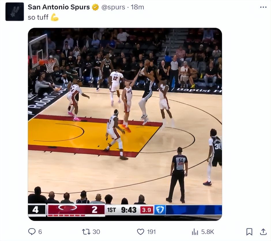 NBA官网也的确将文班亚马的身高更新到7尺5,他此前在对阵广州的首秀中拿到9分10篮板7助攻6失误3盖帽的准四双,此役面对热火他继续先发登场,首节文班亚马6分钟里3中2拿到5分3助攻1盖帽0篮板,他的金鸡独立出手非常精彩。