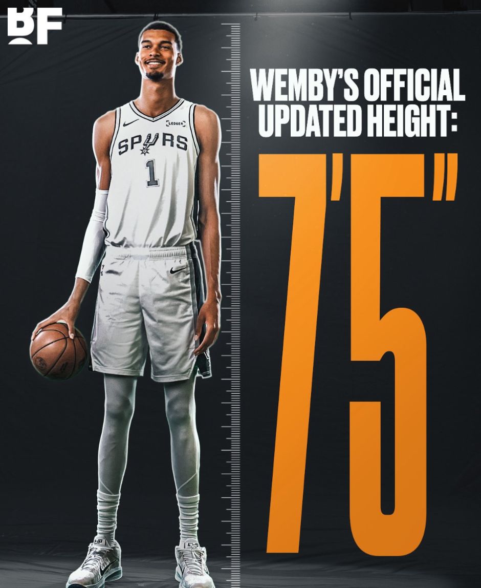赛前NBA官方将文班亚马的身高更新到7尺5,体重235磅,也就是说文班亚马媒体日的体测还是7尺4,短短几天后文班亚马已经长高2厘米。