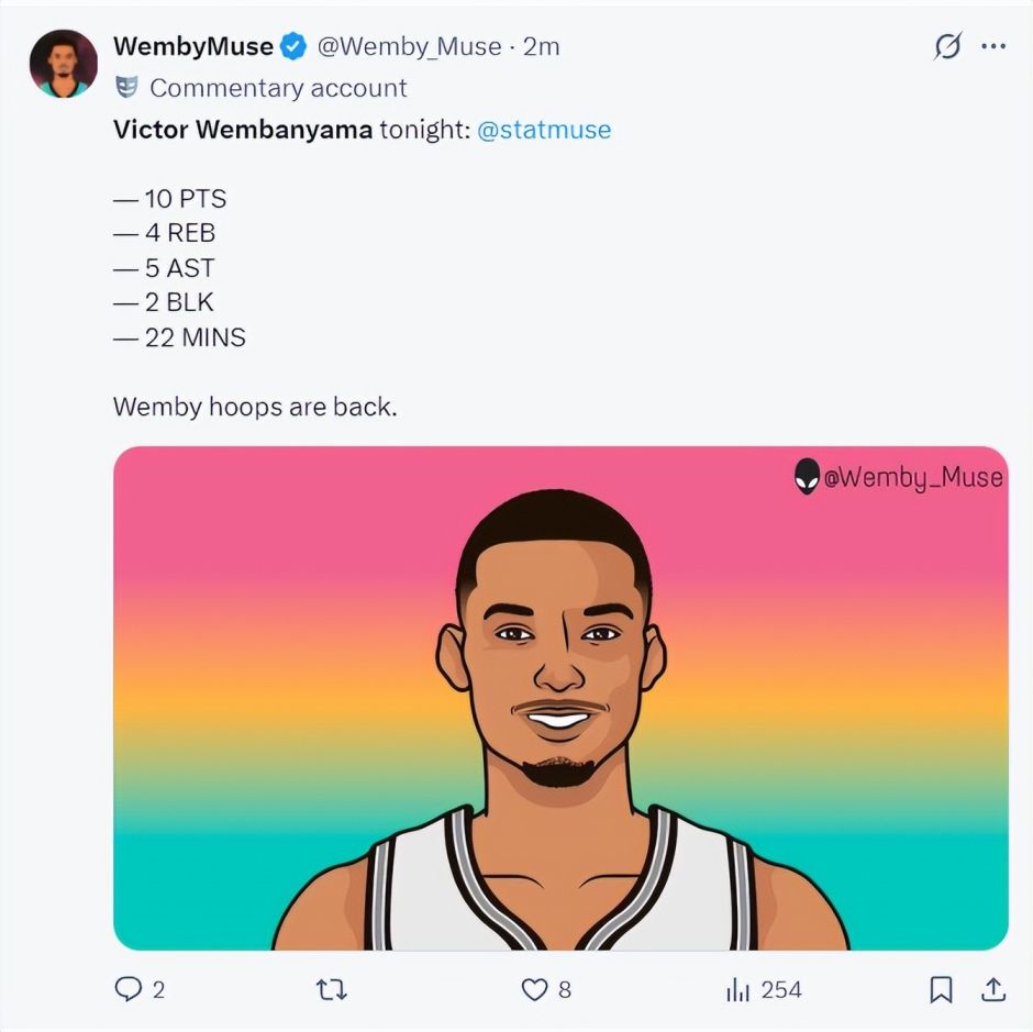 末节文班亚马没有继续登场,三节21分49秒,9中4,罚球4中2,拿到10分5助攻4篮板5失误1抢断2盖帽,命中率44.4%。美中不足就是最近两场比赛11个失误。