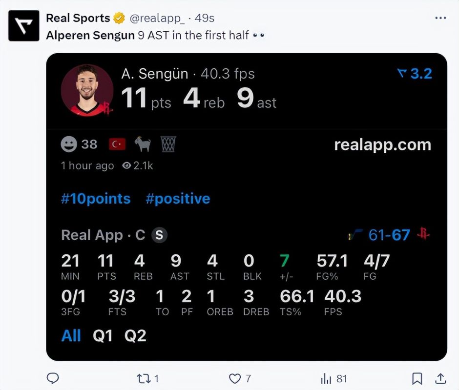 从申京的串联来看说他就是火箭约基奇都不为过,阿门、谢泼德的串联能力都非常有限,球队的进攻流畅性完全依靠申京,助攻戴维森三分、助攻卡佩拉暴扣、助攻阿门暴扣,次节单节申京6分4篮板7助攻2抢断攻防一体,半场7中4拿到11分9助攻4篮板4抢断,申京首秀是19分6助攻5篮板2盖帽,都太出色了。