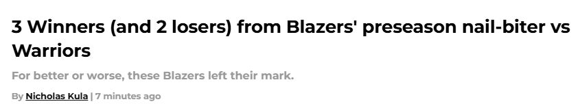 北京时间10月9日,开拓者季前赛首战123-129输给勇士,遭遇21分大逆转。波兰特媒体Rip City Project赛后对本场比赛的表现进行点评,列出了队内首战的3个赢家和2个输家。杨瀚森因表现不佳,和格兰特一起被列为输家。以下是拓媒的解析——