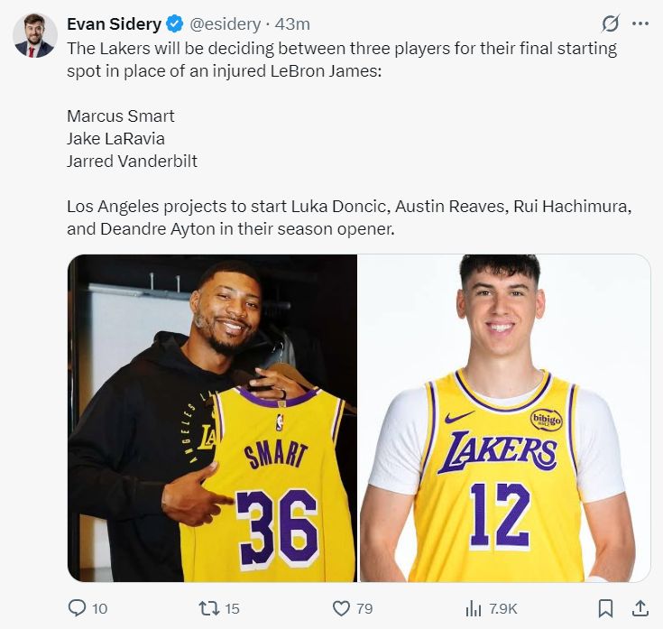 也因为勒布朗-詹姆斯受伤的情况,新赛季湖人开打后先发阵容会有调整,根据NBA记者埃文-斯迪瑞的报道,湖人队目前确定的先发只有东契奇、里夫斯、八村垒、艾顿四人,顶替詹姆斯的第五人会从马库斯-斯玛特、拉拉维亚、范德比尔特之间产生。