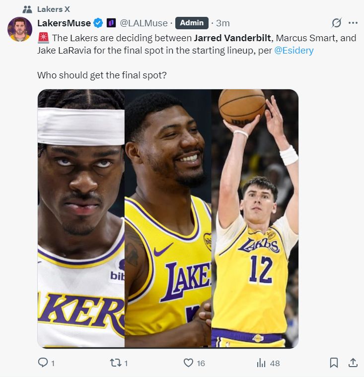 随后湖人媒体就询问自家球迷:斯玛特、拉拉维亚、范德比尔特谁能拿到最后一个先发名额?
