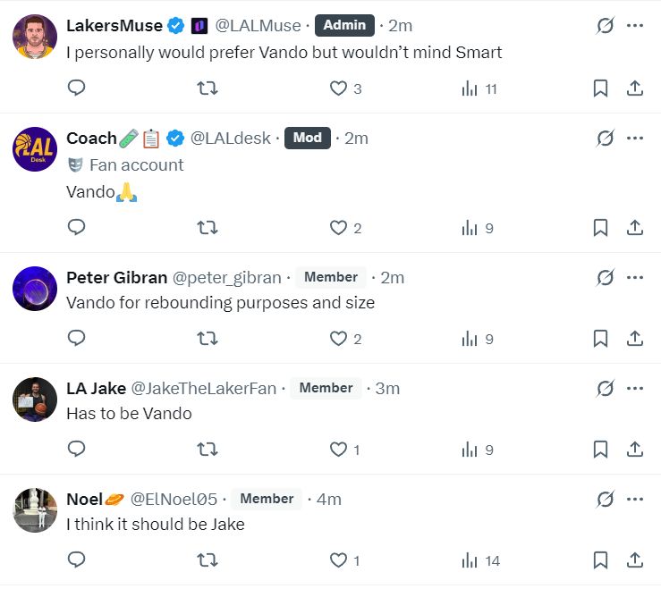 从目前湖人球迷的回复来看,更多的人觉得是范德比尔特,毕竟范德比尔特的尺寸在那摆着,斯玛特先发就等于是三后卫,拉拉维亚的防守能力也不如范德比尔特。