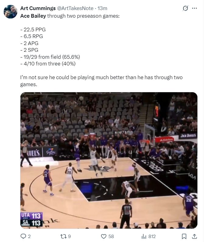 也就是说贝利两场比赛29中19,三分10中4,拿到40分13篮板4抢断,命中率65.5%,三分命中率40%,这位19岁的年轻新星让爵士媒体盛赞。