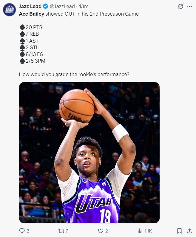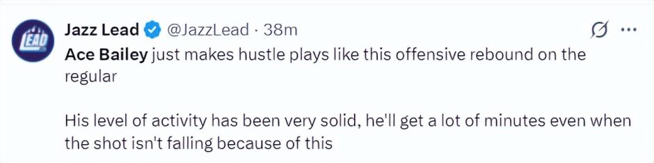 爵士媒体:贝利除了进攻端外,他也积极拼抢前场篮板球,他的竞技状态很稳定,就算没能命中投篮他也可以帮助到球队,相信他新赛季可以获得大量登场时间。