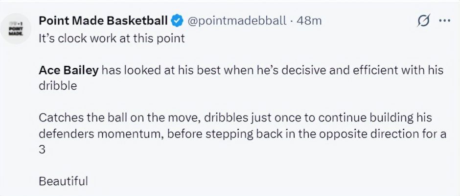 美媒PMB:贝利的一切都井然有序,运球果然能做出高效的过人动作,移动中接球后只运了一次球利用惯性就晃开了防守者,他的投篮动作也非常漂亮,进攻天赋很好。