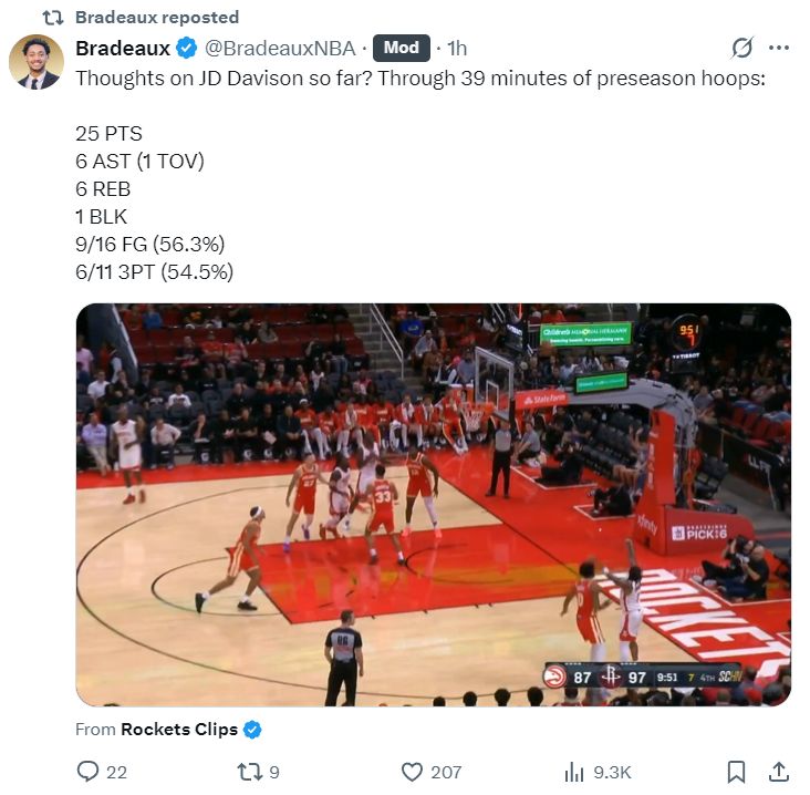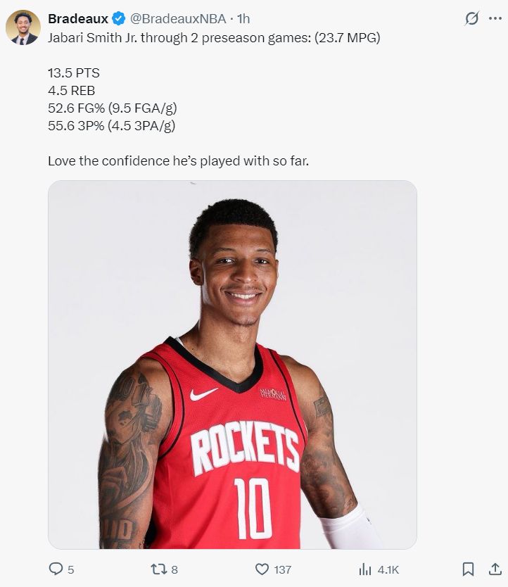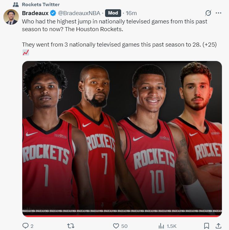 北京时间10月12日,火记Bradeaux写道,你们知道谁是有全美转播比赛中,谁的跳投最准吗?是休斯顿火箭队。联盟也将3场的全美转播提升到28场。
