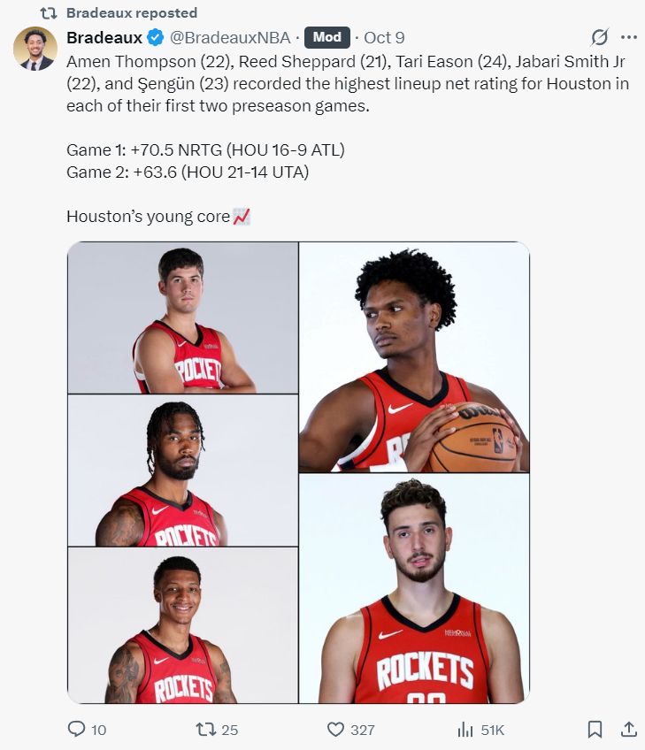 正如此前所说杜兰特的加盟是锦上添花,火箭自己培养的年轻核心才是基本盘,首秀:谢泼德、阿门、伊森、小贾、申京搭档首战净效率值+70.5;