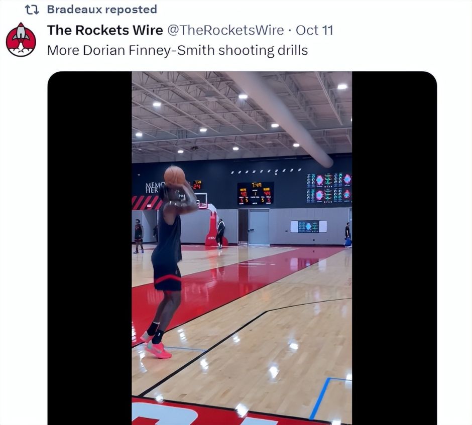 一天之前,休斯顿媒体晒出芬尼-史密斯进行投篮训练的视频,DFS两个底角折返跑接球投篮6中5,但他明显还没有恢复到正常的体能,这几个球后他已经累的双手撑膝,就算他伤势痊愈也需要一些时间来调整身体状态。