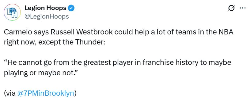 北京时间10月12日,9届全明星后卫威少仍未与任何NBA球队签约,前队友安东尼在播客节目上谈及此事,他很同情威少的处境,也感同身受。