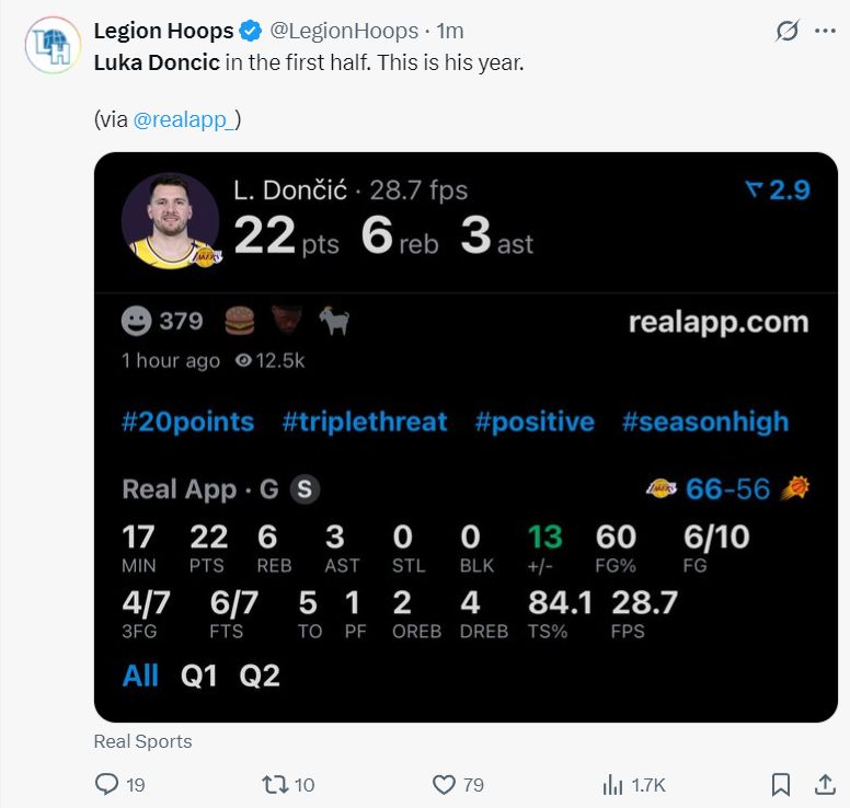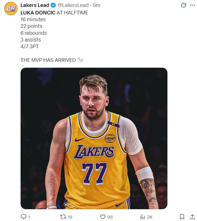 湖媒晒出东契奇半场数据写道:MVP来了。