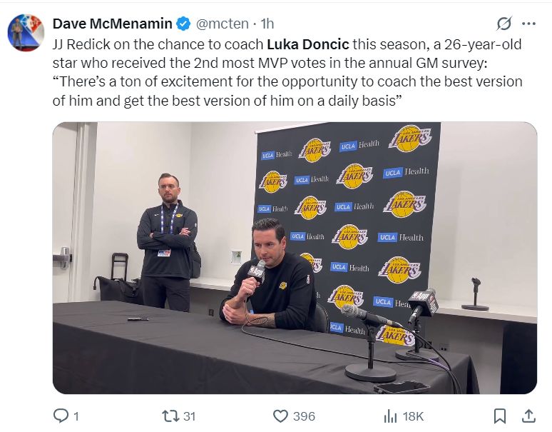 赛前雷迪克谈到联盟GM调查东契奇获得最多选票:能有机会执教状态最好的他我非常兴奋,我每天都能看到他最棒的一面。