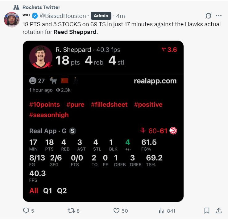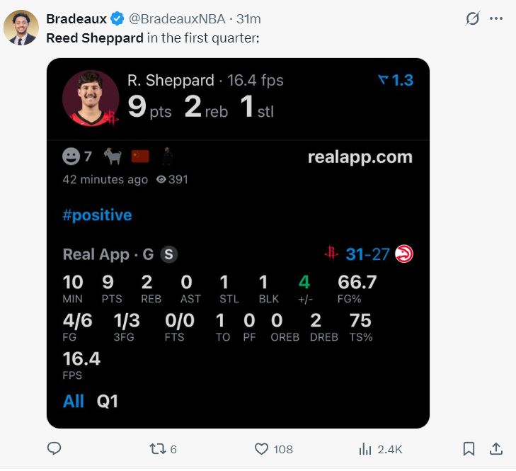 上半场打完谢泼德17分钟,13中8,三分6中2,已经拿到18分4篮板3助攻4抢断1盖帽的完美数据,真实命中率69.2%。