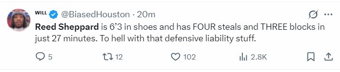 休媒:谢泼德穿鞋身高超过6尺3,他在27分钟里3盖帽4抢断,别再说他防守端是个漏洞了。
