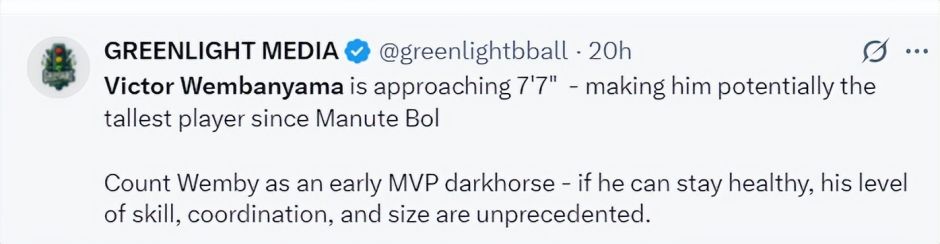 近期外界对文班亚马的身高有巨大的疑问,因为谣传文班亚马的身高又从7尺4长到7尺4,也就是2.24米长到2.31米,多家美媒都将文班亚马视为新赛季的MVP大热门。