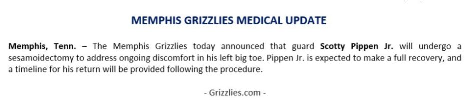 灰熊队官方宣布,后卫小斯科蒂-皮蓬将因左脚大脚趾受伤接受手术,据消息人士透露,他将在12周后重新接受评估。灰熊队表示,小皮蓬将接受籽骨切除术以处理他们所说的“持续不适”,预计他将完全康复。
