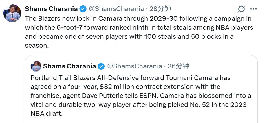此次续约后,开拓者队将卡马拉的合同锁定至2029-30赛季。上赛季,这位身高6英尺7英寸的前锋展现出极强的防守影响力:全联盟抢断总数排名第九;成为全联盟仅有的7名单赛季完成“100次抢断+50次盖帽”的球员之一。