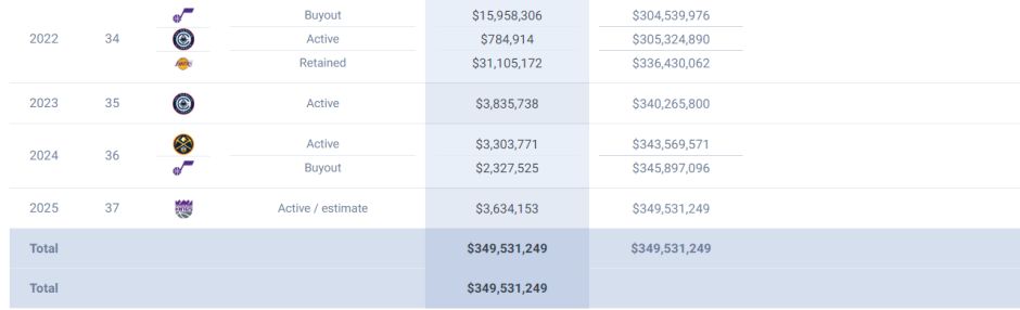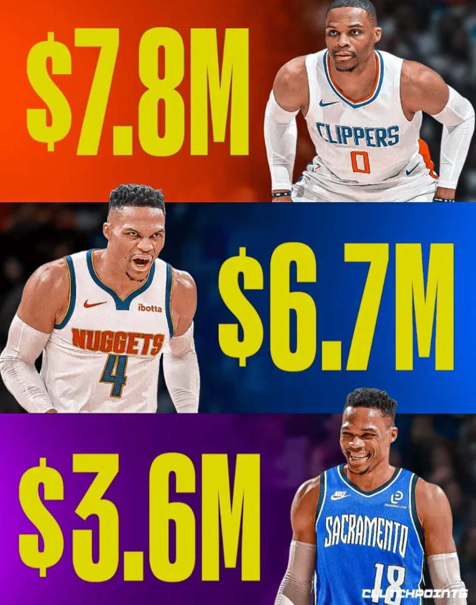 从湖人离开后威少实际上赚到的薪水只有78万+383万+562万+360万,合计只有1383万,这里面还有360万不知道能不能全额拿到,威少从一个年薪4000+万的超巨沦为联盟的边角料。