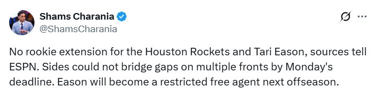火箭的媒体人Will写道:“火箭队与伊森未能在今日截止日期前达成续约,好消息是,这并不意味着我们会失去他。受限制自由球员制度的存在,能防止球员在新秀合同到期后直接离队。明年夏天,无论伊森收到何种报价,火箭队都有权匹配。但坏消息也有两点。一是我不确定伊森会如何看待这次未能续约 —— 显然他非常希望能敲定这份合同,我也绝不希望他下赛季陷入‘证明自己’的被动局面。二是尽管这并不代表伊森会在自由市场离队,但这确实会增加火箭队考虑交易他的可能性。”
