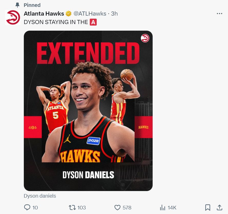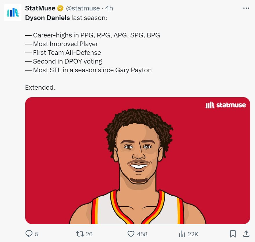 老鹰官方也发推祝贺戴森与球队达成续约,上赛季的戴森场均14.1分5.9篮板4.4助攻3.0抢断,他是自95-96赛季手套佩顿后场均抢断最高的球员,他已经是联盟最顶尖的防守者。