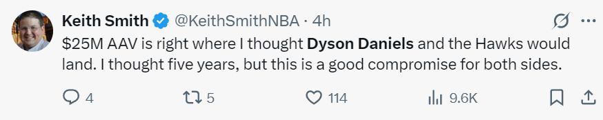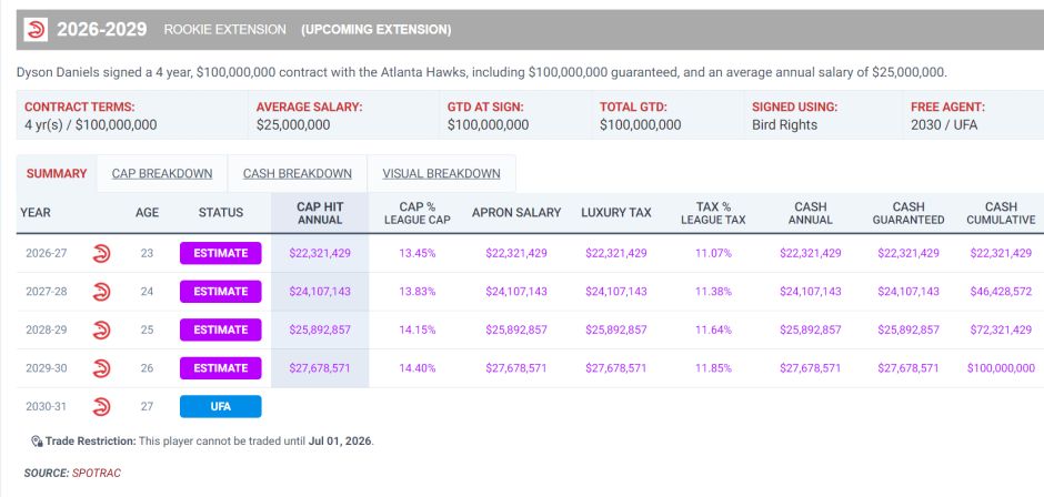 亚特兰大老鹰队与戴森-丹尼尔斯达成了四年1亿的合同,这份合同均薪仅为2500万,戴森-丹尼尔斯是2022届首轮第八顺位的新秀,上赛季被交易到老鹰后开始在联盟崭露头角,他拿到最佳一防、最快进步球员、DPOY投票第二等荣誉。