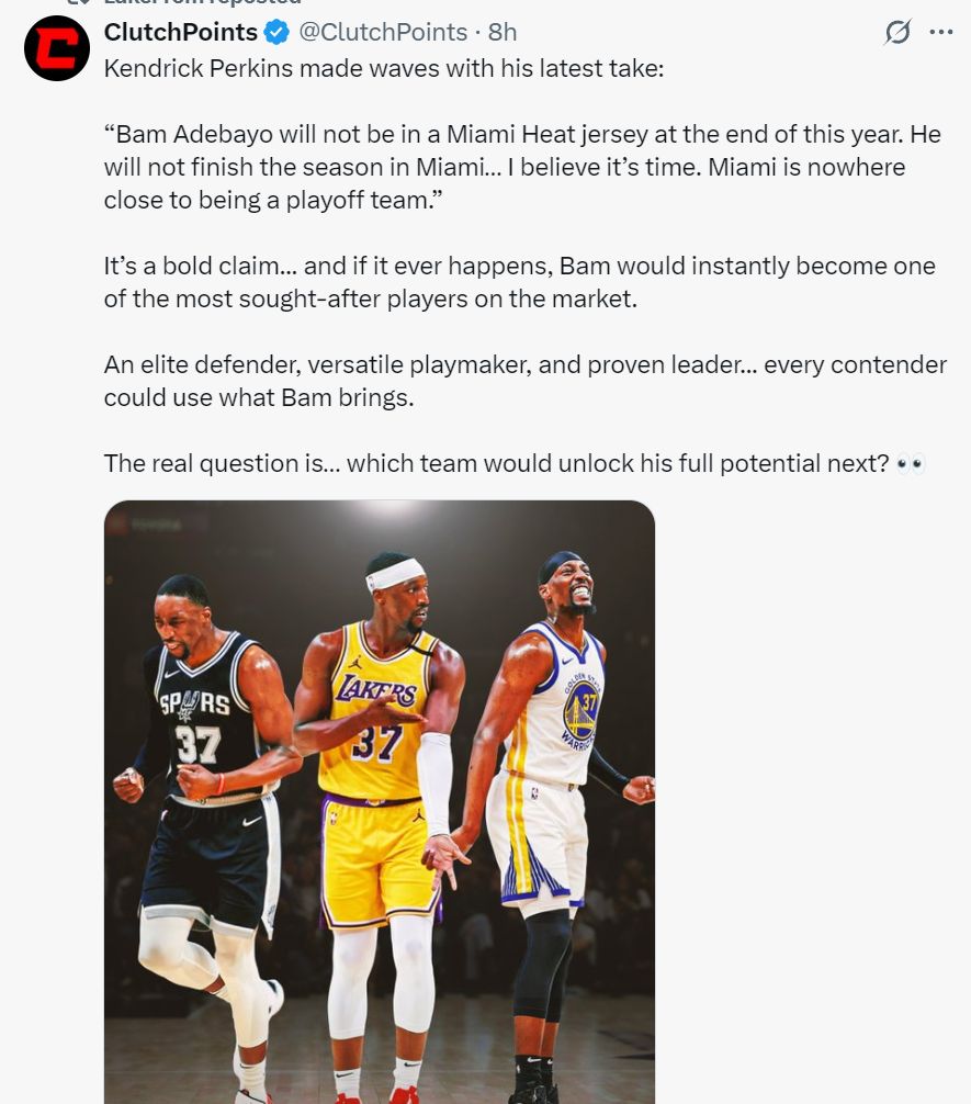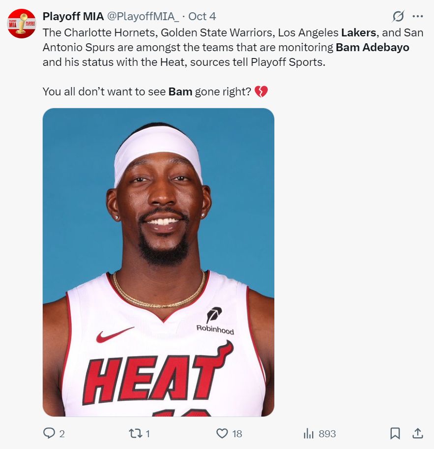 实际上在10月4日,就有美媒爆料,夏洛特黄蜂、金州勇士、洛杉矶湖人、圣安东尼奥马刺都在密切关注巴姆-阿德巴约以及他在热火队的状况。