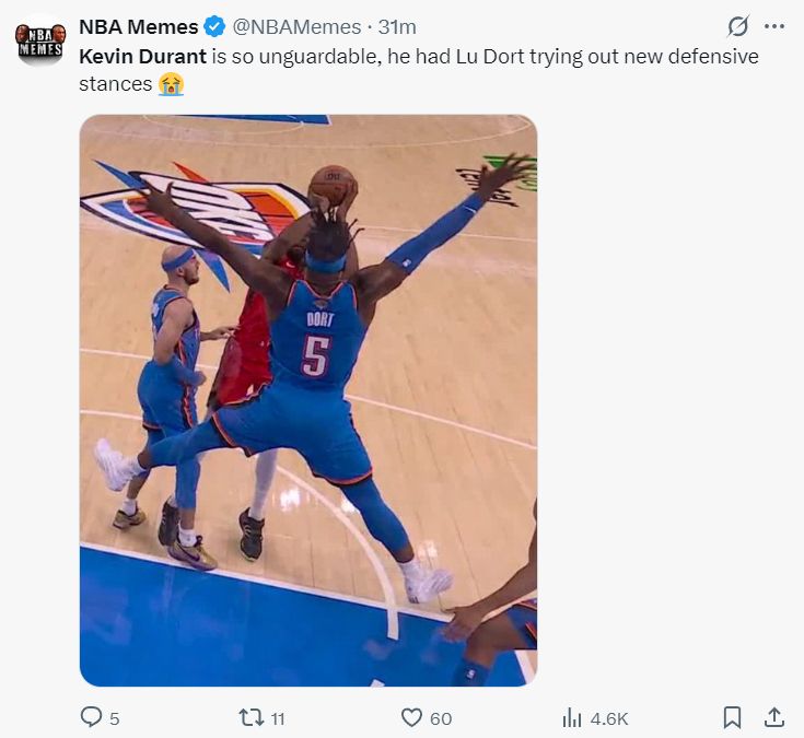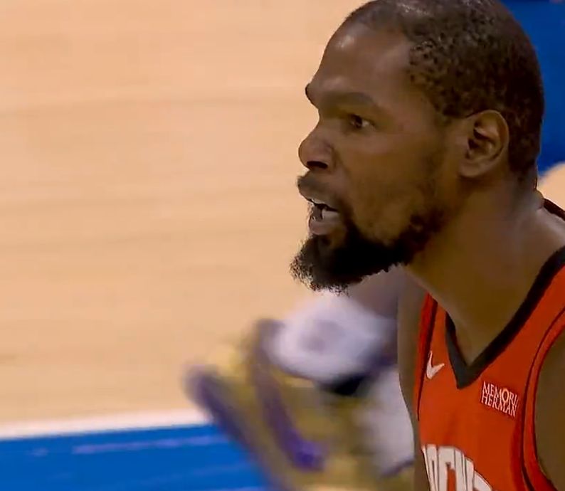 KD第二节的中距离是真的准,感觉只要他能顺利出手就要进,唯一一个没进的是面对切特的翻身跳投,单节8分钟里4中3拿到6分4篮板1助攻,半场20分钟,11中6拿到14分5篮板1助攻。