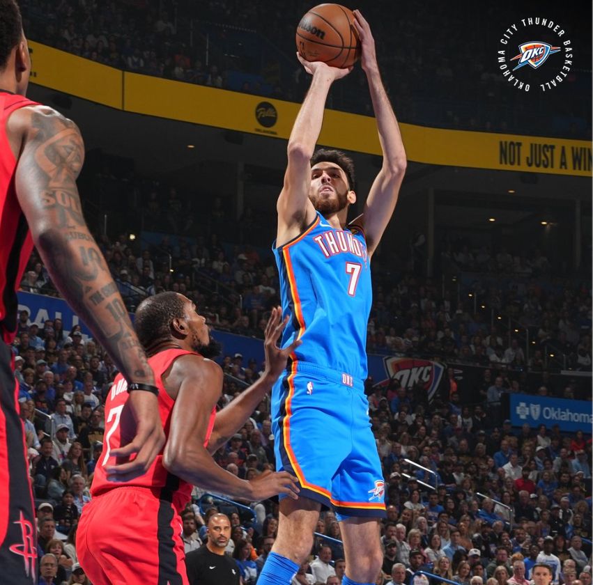 次节开场切特面对申京又完成2+1,切特踩线超远中投,他第八次出手才投丢,第九个球是真的三分结果没进,次节4中2拿到5分3篮板,半场霍姆格伦18分钟,9中7拿到18分4篮板苦撑全队,SGA半场只有5分。