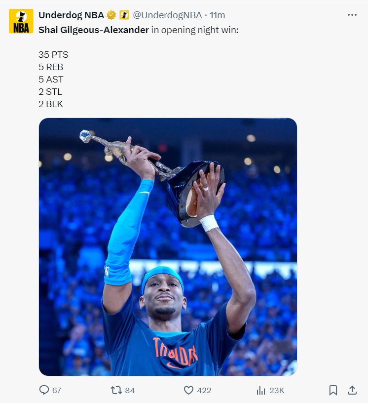 SGA在下半场才发威,第三节6分,末节5中4拿到12分3篮板1助攻1抢断,他上半场只有5分,是他末节的表现帮助雷霆拖入加时赛。进入加时赛切特命中三分,随后亚历山大又命中三分,雷霆领先到6分,SGA中投继续有,切特再中三分,申京传球被SGA断掉,SGA绝杀未能命中。